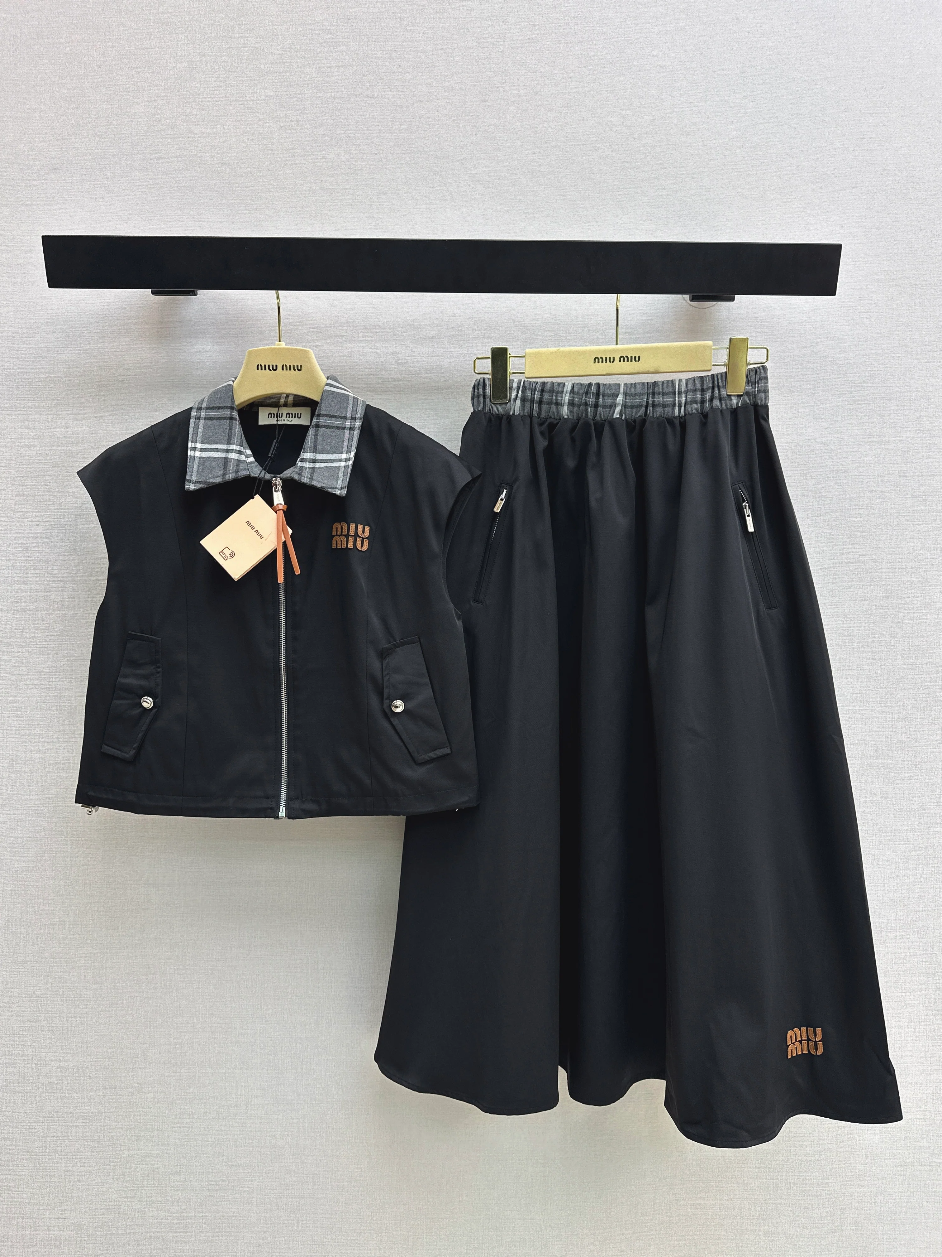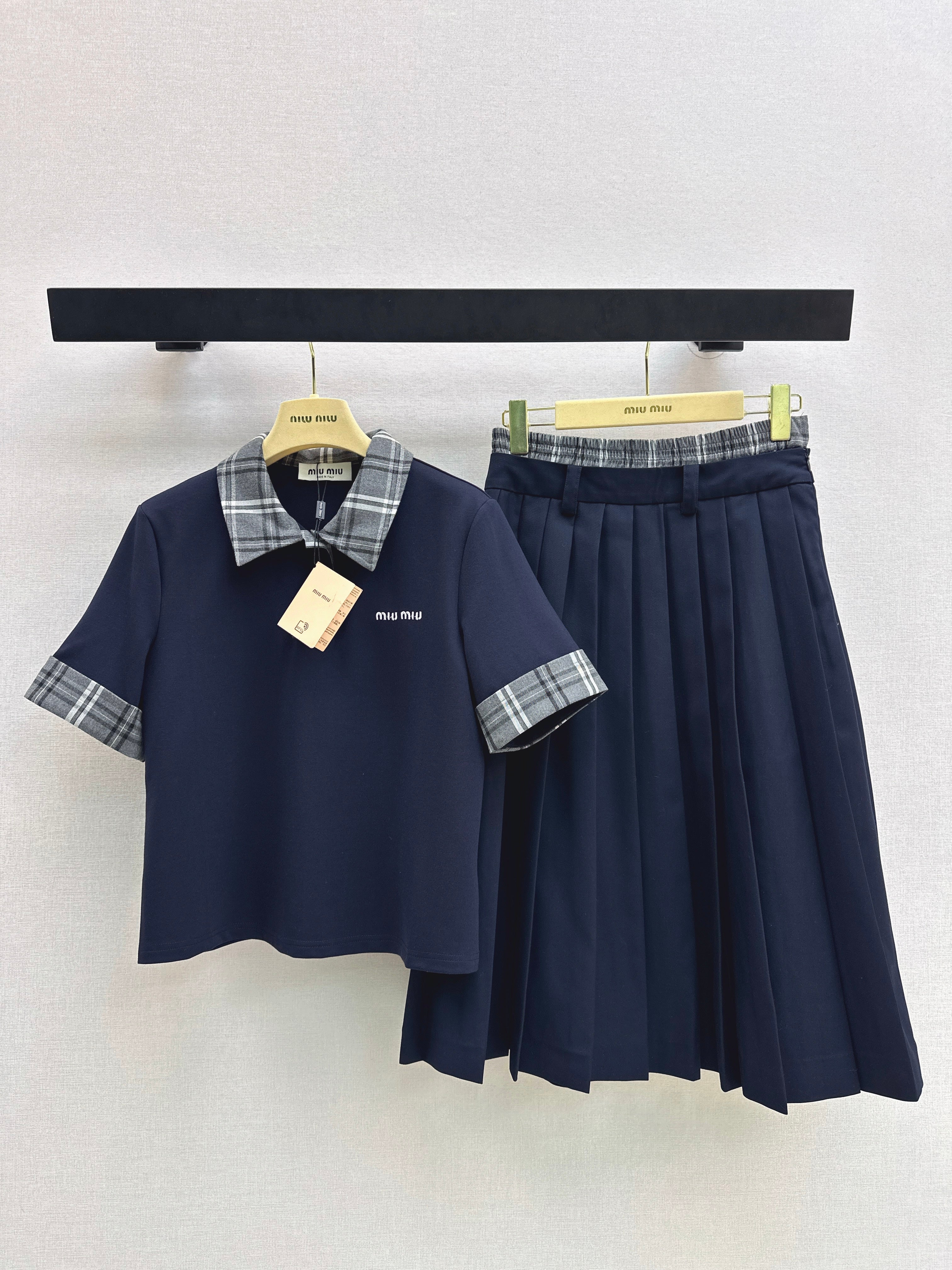 Miu NEW patchwork top + faux two-piece pleated skirt set